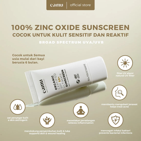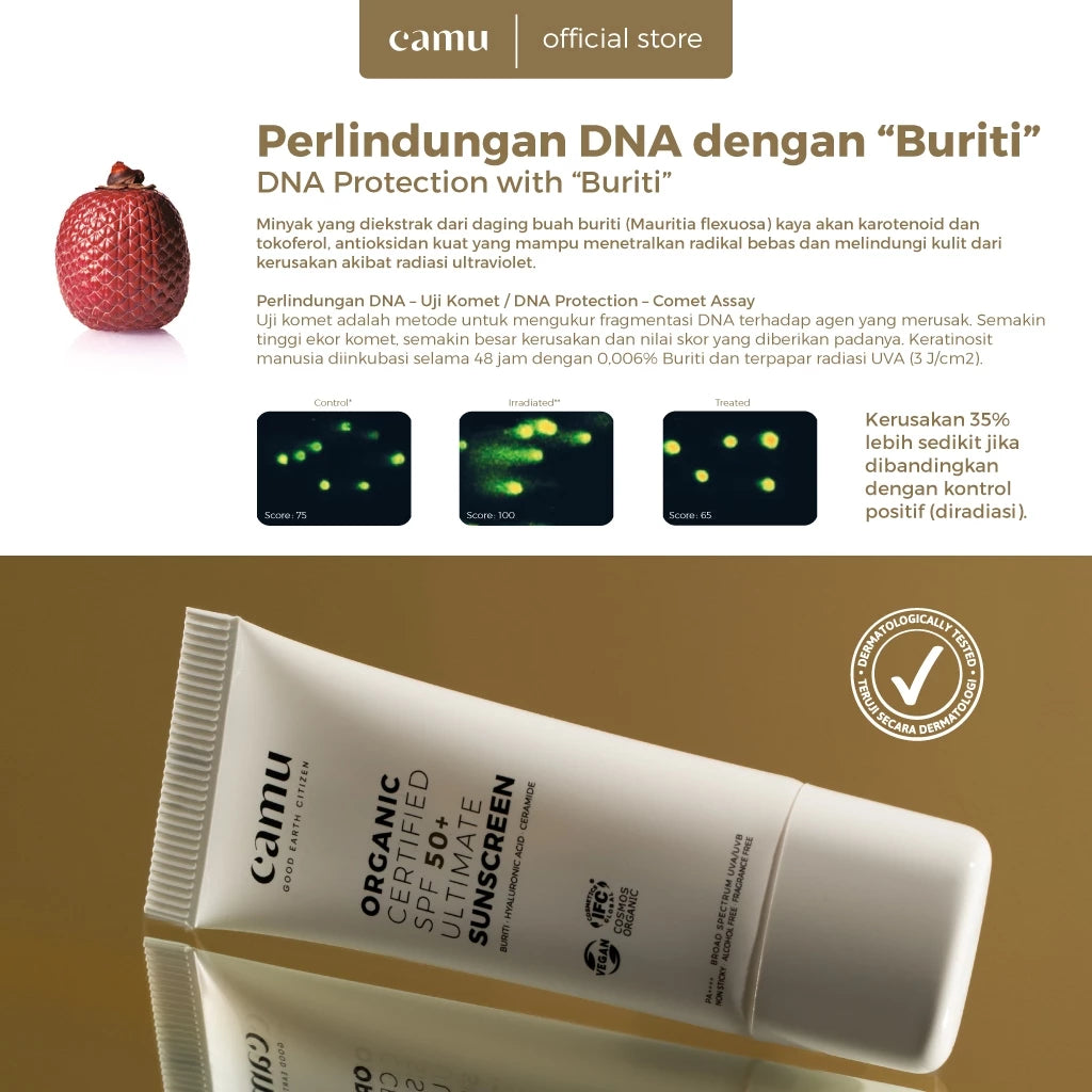 Formulated with certified organic ingredients and advanced natural technology, CAMU defends against UVA & UVB rays while nourishing and strengthening your skin barrier.
